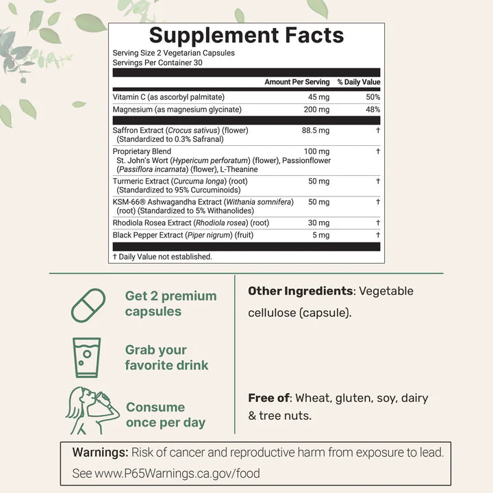 Saffron works powerfully on its own, but it's even more effective when paired with synergistic compounds. Ashwagandha reduces cortisol and stress, rhodiola enhances mental resilience, and magnesium supports sleep and nervous system calm. Together, they create a complete mood and brain health solution.